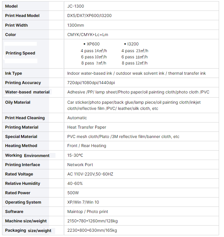 Excellent quality JP1301/1302 is a 1.3m/4ft eco solvent printer with intelligent temperature control and triple drying, especially suitable for printing outdoor advertising, signs, car stickers, pp paper, etc.